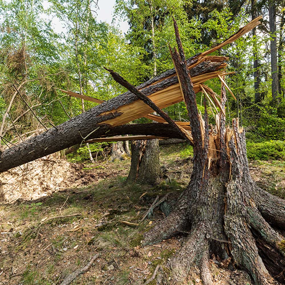 Stürme hinterlassen in Wäldern oft eine Spur der Verwüstung. Als Forstbetrieb ist es in einem solchen Fall unsere Aufgabe, die Schäden an den Bäumen zu beseitigen, abgeknickte Äste und entwurzelte Bäume abzutransportieren und die notwendigen Voraussetzungen dafür zu schaffen, dass Sie als Waldbesitzer so bald wie möglich mit der Wiederaufforstung beginnen können. Dank unserer Maschinen und Transportfahrzeuge sind wir imstande, selbst beträchtliche Mengen an Sturm- und Totholz zu befördern.